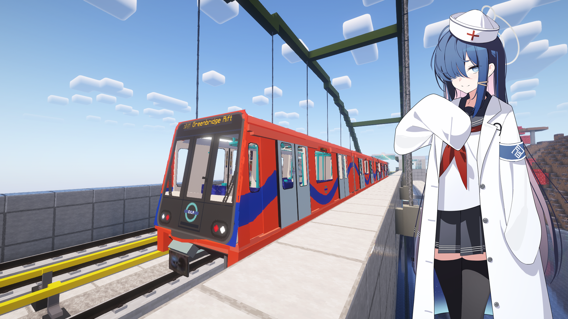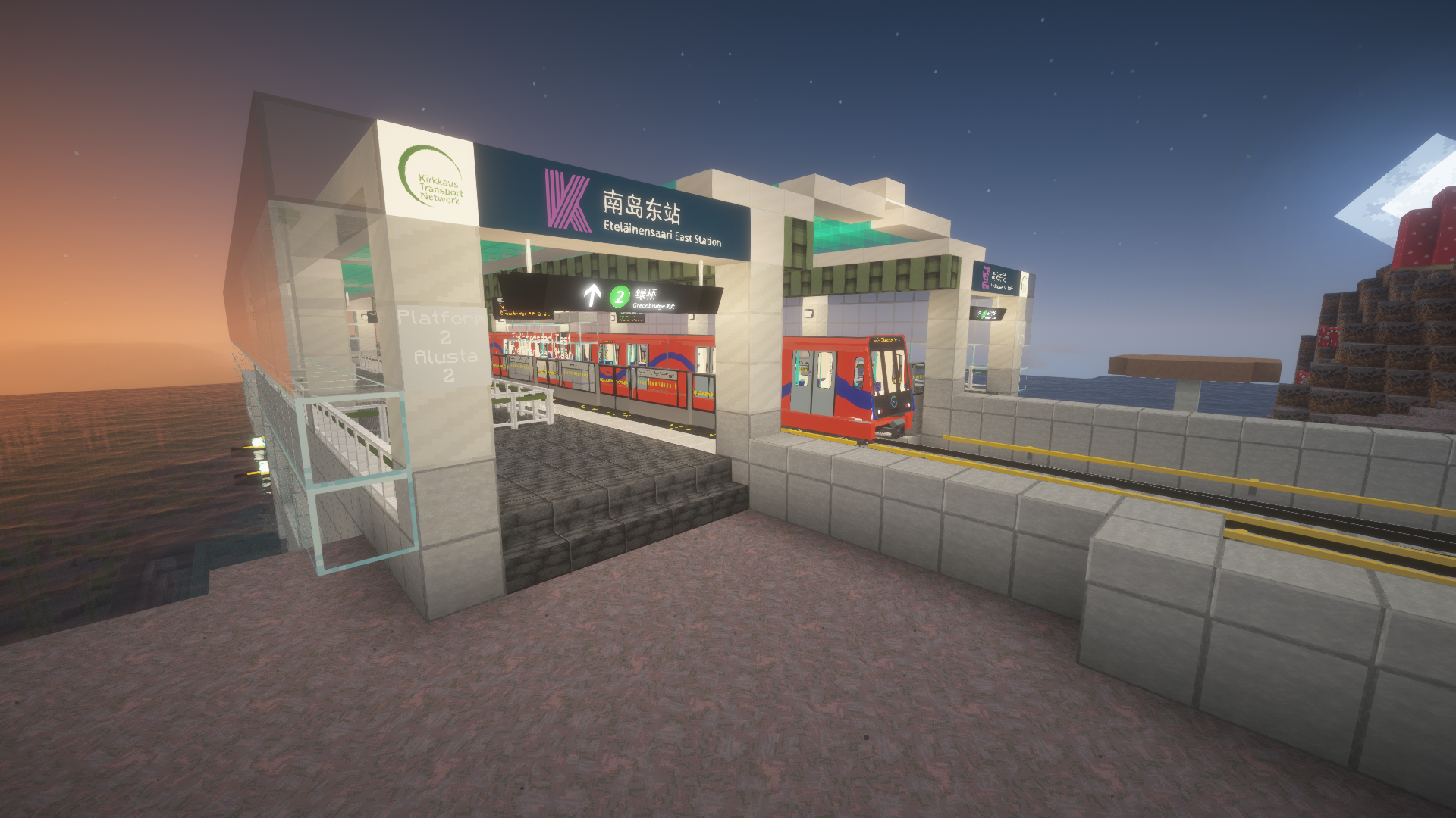 南岛东站最初同样由Lumi修建,后由yiranxiaoxiong和Maki_Konuri合作改造。车站已从原观光平台的结构中独立出来,整体南移。新的独立站厅建于其下,并由两座步行桥轻盈连接观光平台。为保护海底神殿,一座拱桥从车站北侧凌空而起,优雅地跨过观光平台。与此同时,橡子岛至南岛东的路段也进行了重建。未来还将在车站南侧(南岛地下)修建地下联络通道以沟通线路两侧。